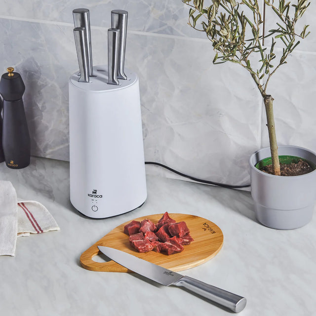 Ovaj 5-dijelni set noževa dolazi s modernim stalkom koji omogućava UV i Ozon sterilizaciju, osiguravajući higijensko i sigurno čuvanje noževa.