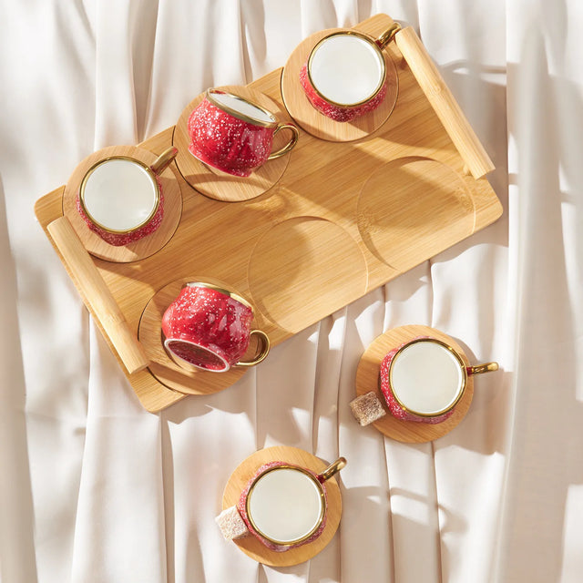 Karaca Bambu set šoljica za espresso i tursku kavu u elegantnoj crvenoj izvedbi donosi toplinu i sofisticiran izgled svakom stolu. Zahvaljujući prirodnom bambus pladnju i kvalitetnoj izradi, ovaj set idealan je za svakodnevne rituale ispijanja kave ili posluživanje gostiju.