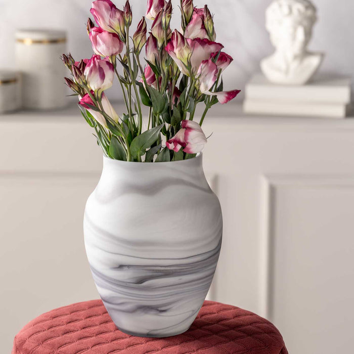 Pretvorite svoj dom u oazu stila i blagostanja uz ručno izrađenu vazu iz serije POESIA. Ova nježno oblikovana vaza u sivoj boji s mramornim efektom unosi sofisticiranost i modernu eleganciju u svaki prostor. Svaki komad je unikat, izrađen s posebnom pažnjom, čime vašem enterijeru dajete poseban, individualan pečat.
