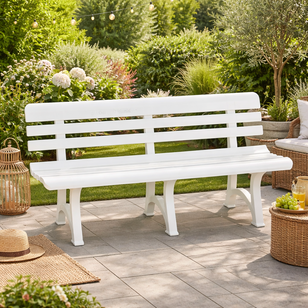 Elegantna i izdržljiva vrtna klupa od kvalitetnog polipropilena, idealna za dvorište, terasu i balkon.