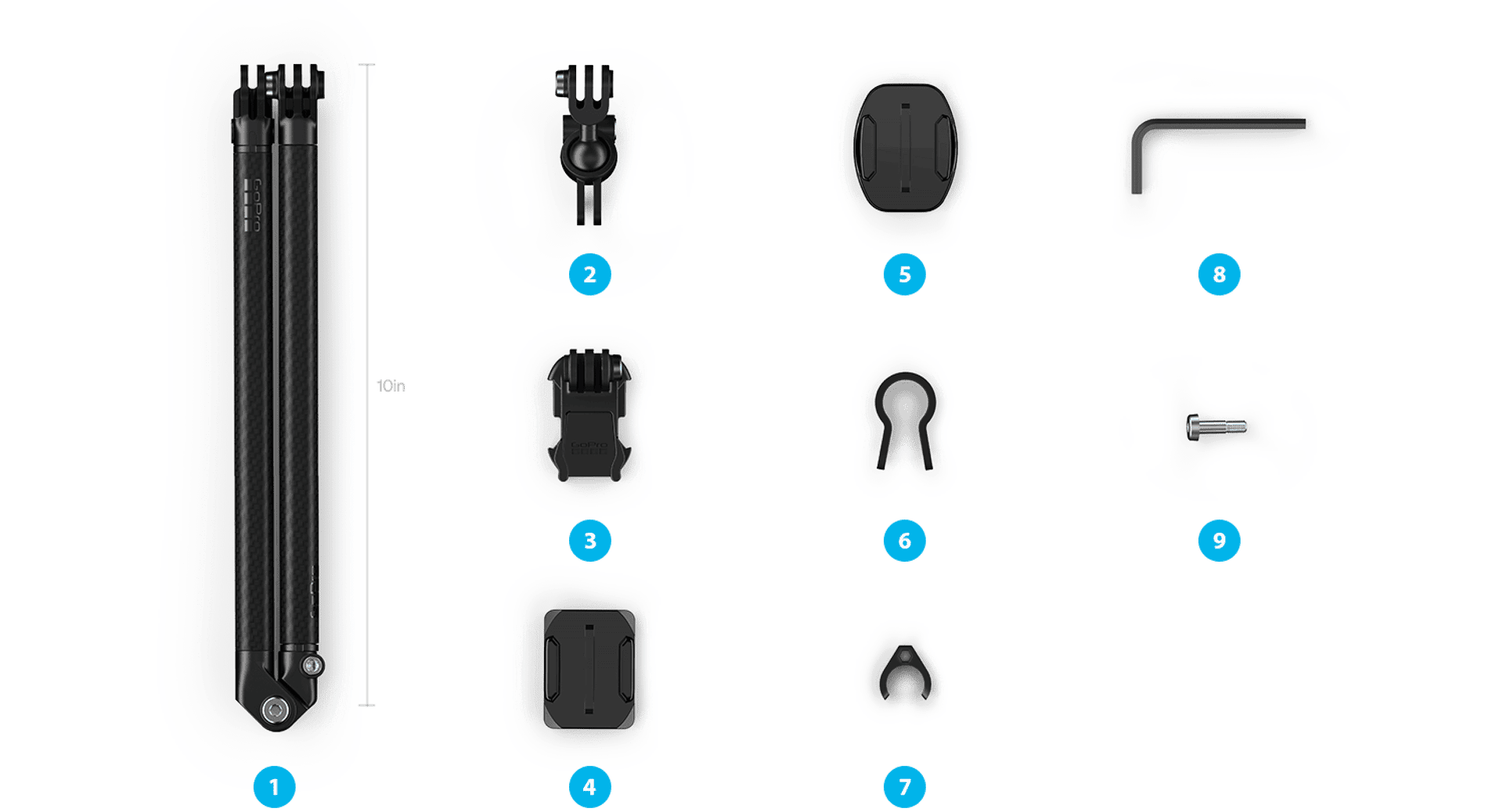 - Uključuje 2 kraka od karbonskih vlakana, nosač kamere s kuglastim zglobom, zakrivljene + ravne ljepljive nosače, kopču za montiranje, klizač za triangulaciju, šesterokutni ključ od 4 mm, 2 dodatna šesterokutna vijka i šesterokutnu kopču za pohranjivanje ključeva