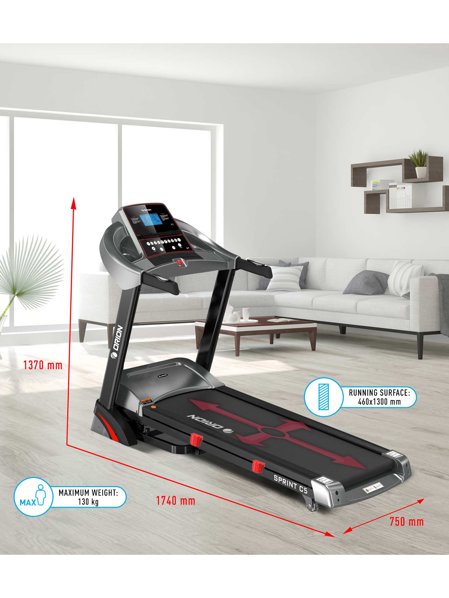 ORION Sprint C5 predviđena je za korisnike do 130 kg. Težina trake iznosi 84 kg (bruto), što doprinosi stabilnosti tokom rada.