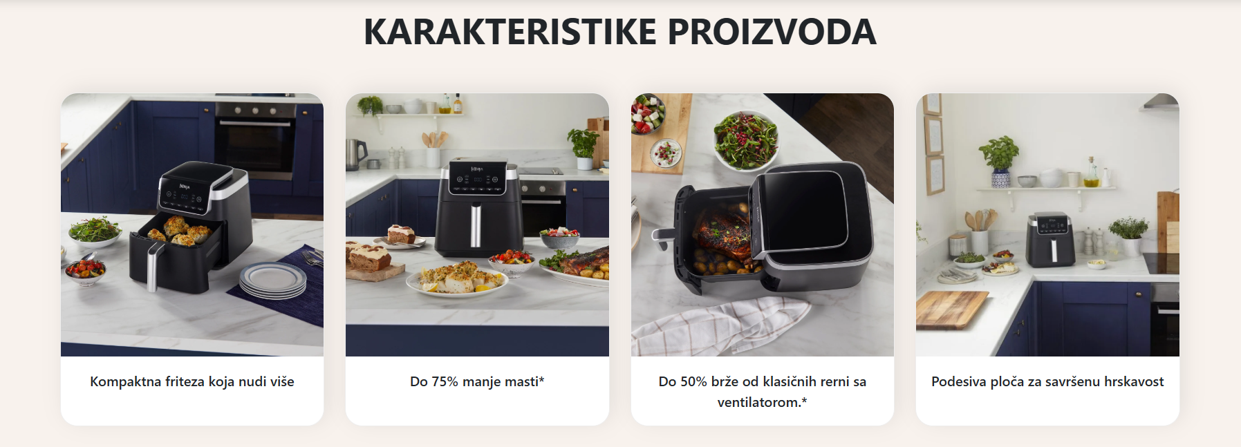 Napredna tehnologija cirkulacije vrućeg zraka omogućava pripremu jela s do 75 % manje masti u poređenju s tradicionalnim prženjem u dubokom ulju. Hrana je gotova do 50 % brže nego u klasičnim ventilatorskim rernama, uz dodatnu uštedu energije i vremena u svakodnevnoj pripremi obroka.